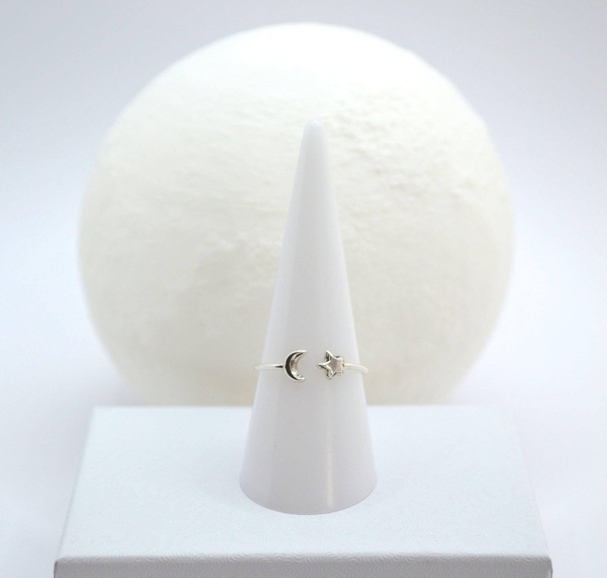 Bague minimaliste ajustable, avec lune et étoile en argent sterling.